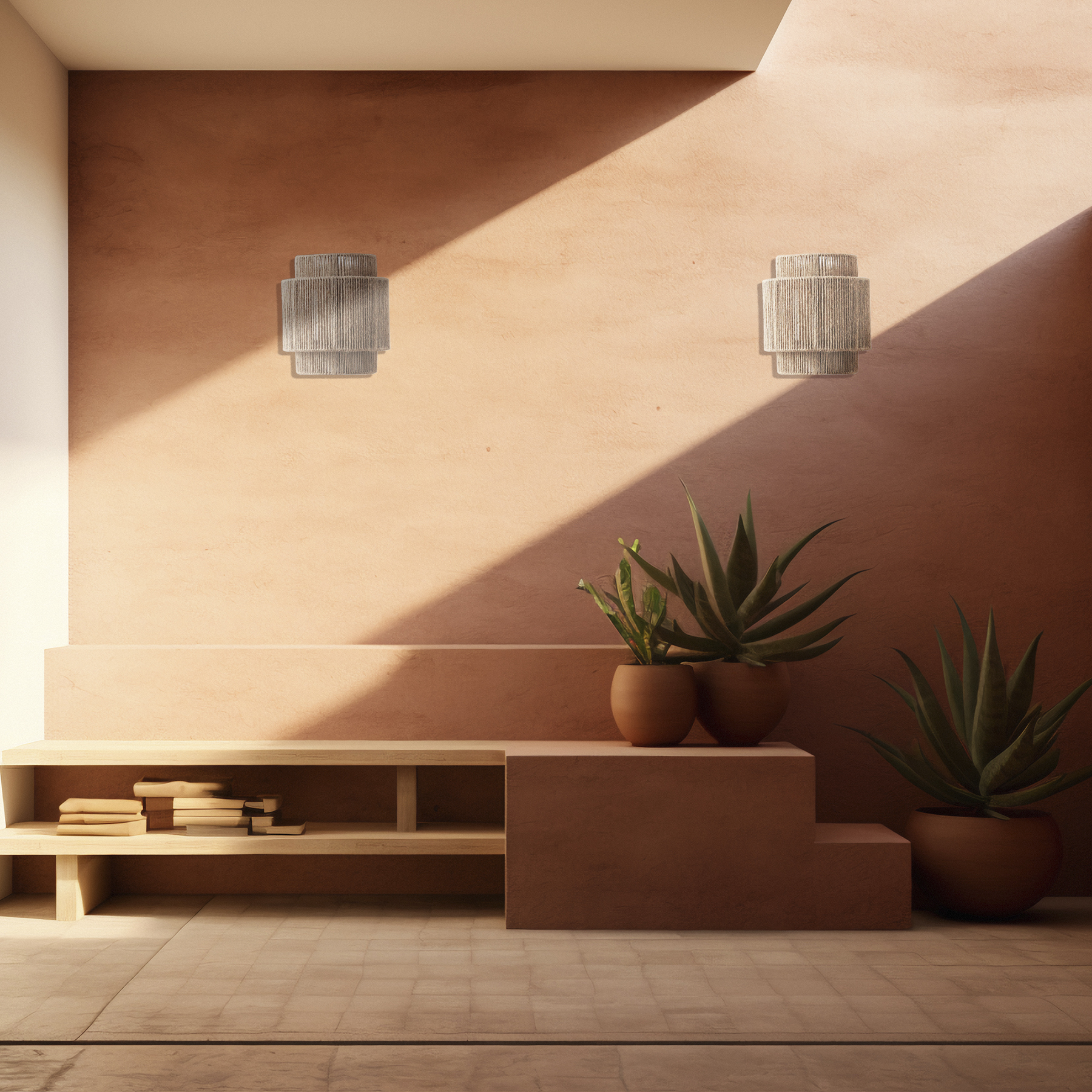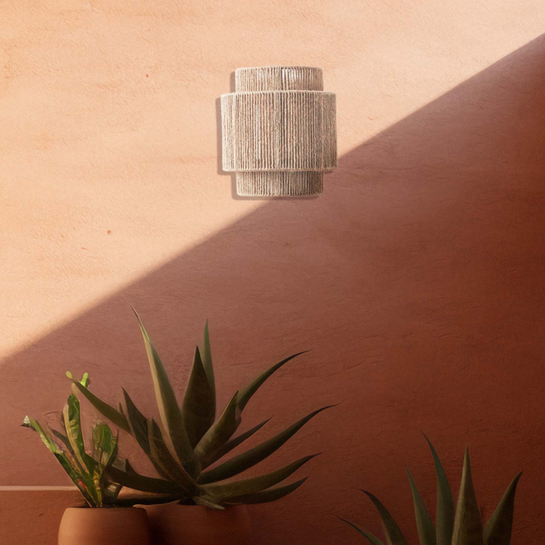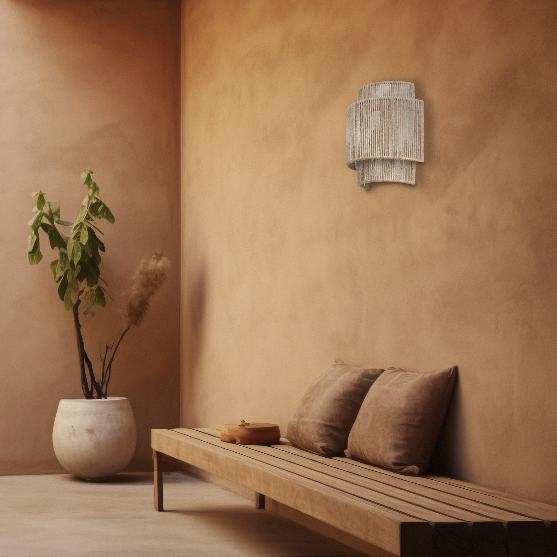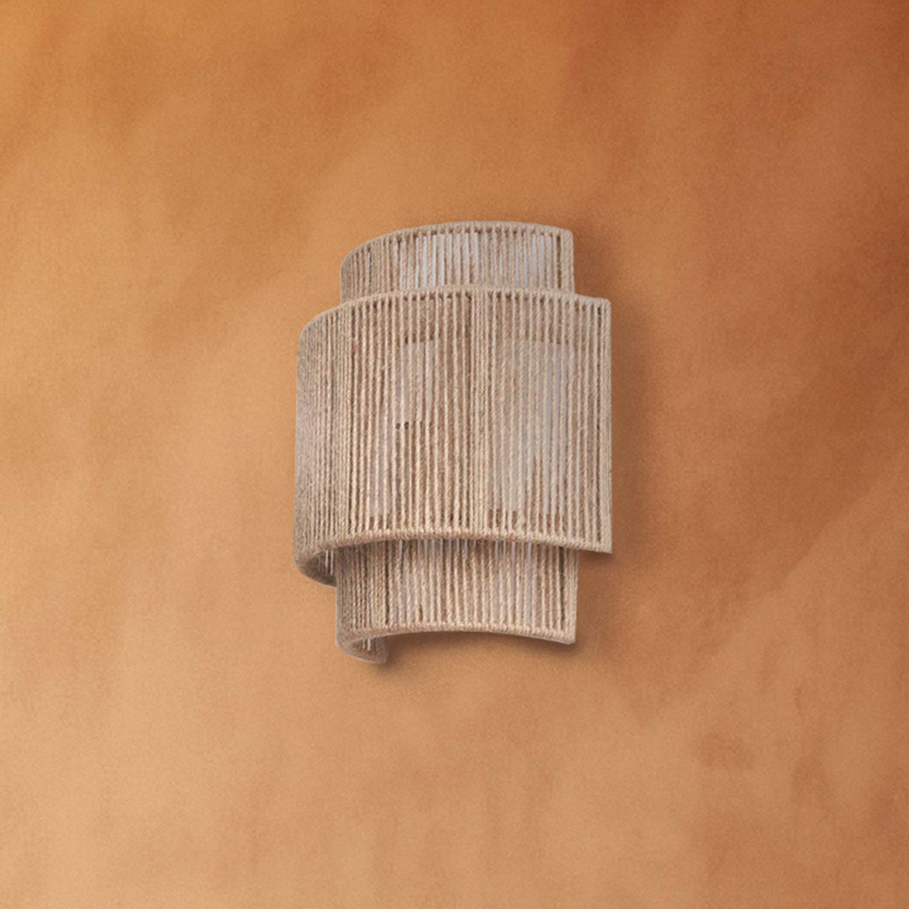 Esta lámpara arbotante de pared, fabricada con hilo de yute combina diseño natural y calidez ambiental en una sola pieza. Hecho con fibra natural de yute entretejido en un diseño cilíndrico de capas, permite que la luz se filtre suavemente, proyectando un brillo acogedor y relajante.
