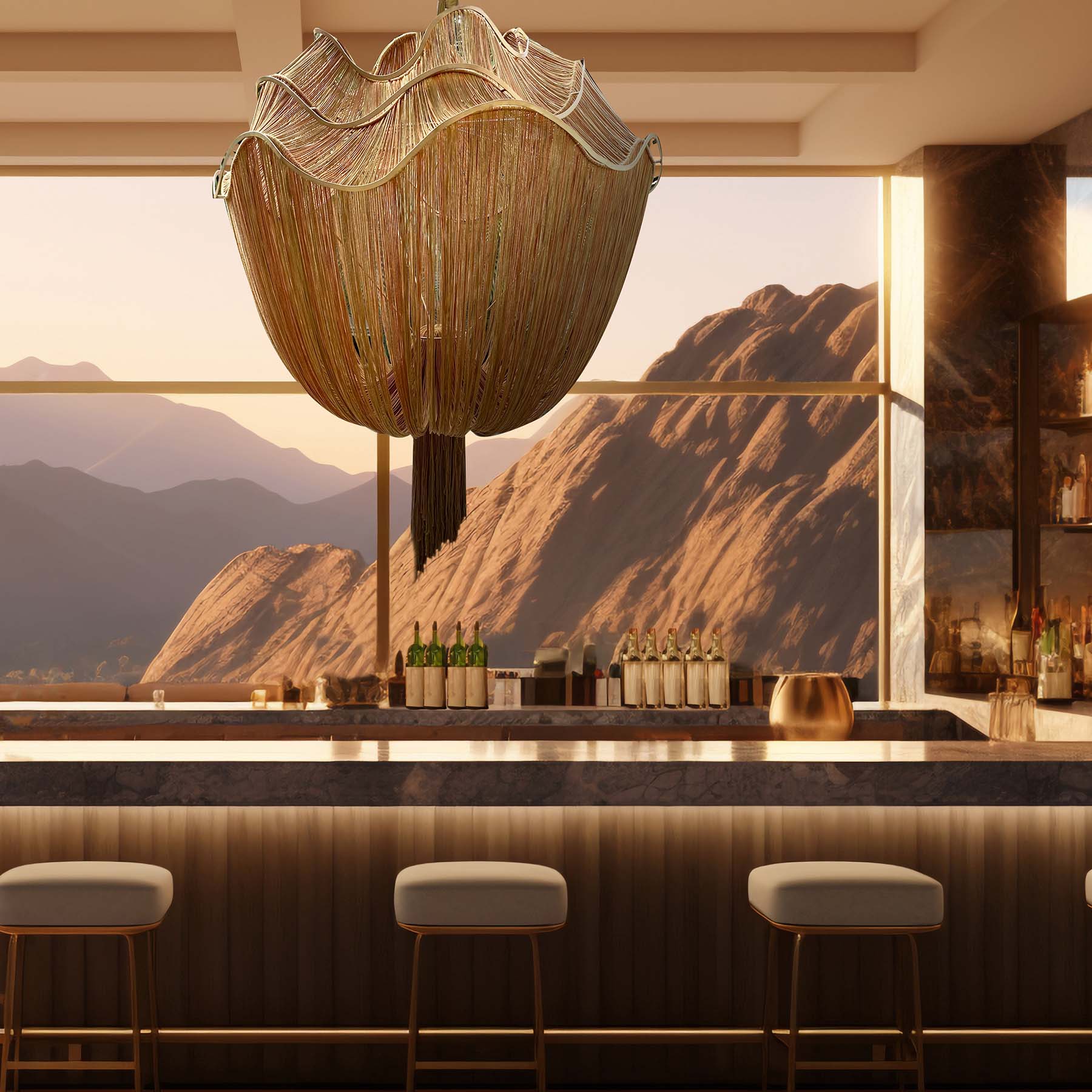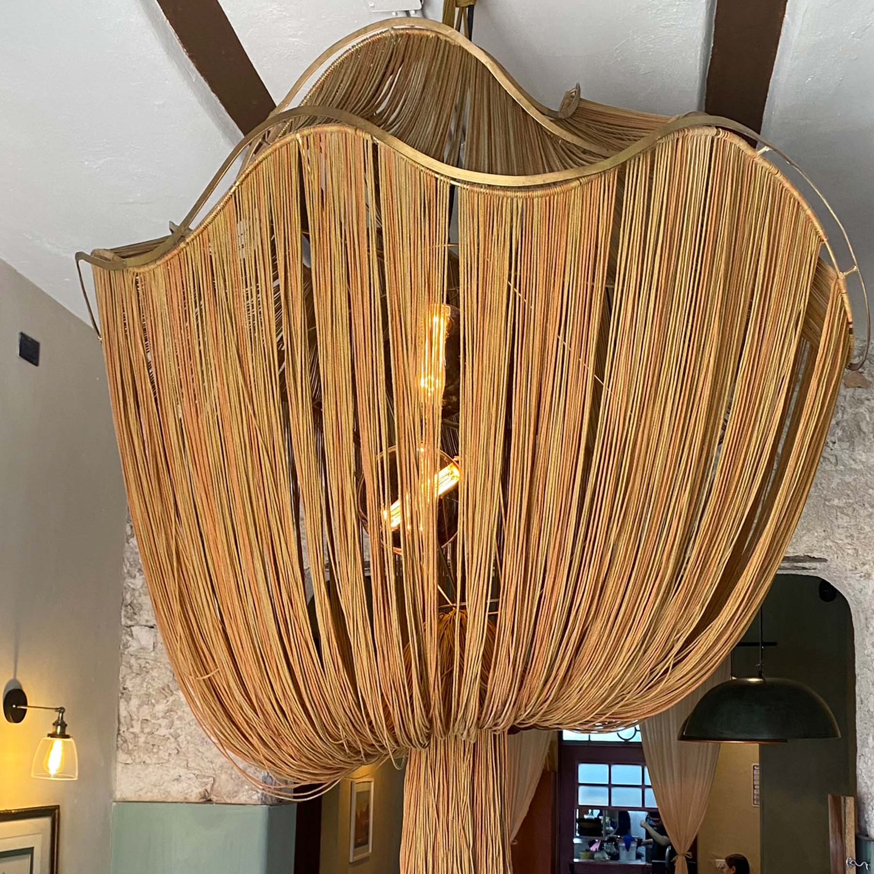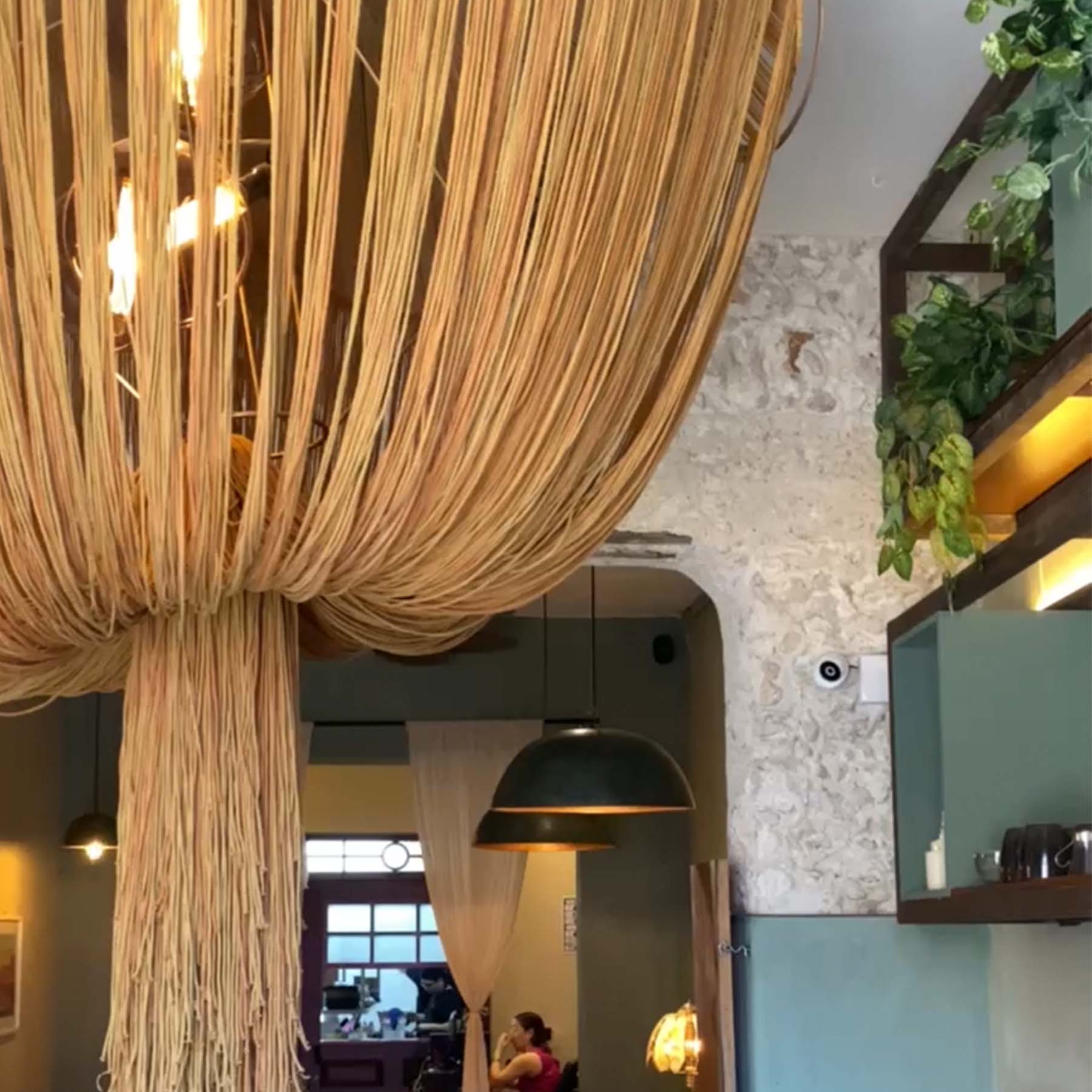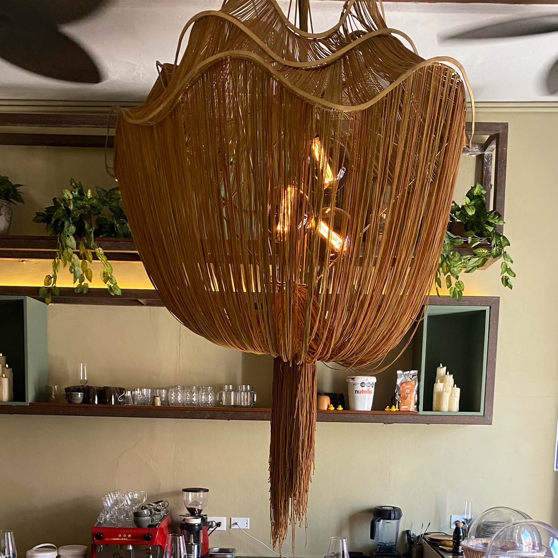Esta lámpara artesanal fusiona elegancia y calidez en una pieza única. Su estructura metálica da forma a un contorno envolvente, mientras que los largos hilos cuelgan con movimiento, filtrando la luz de manera sutil y creando una atmósfera acogedora. Se utilizan dos o tres colores para generar un biselado único.