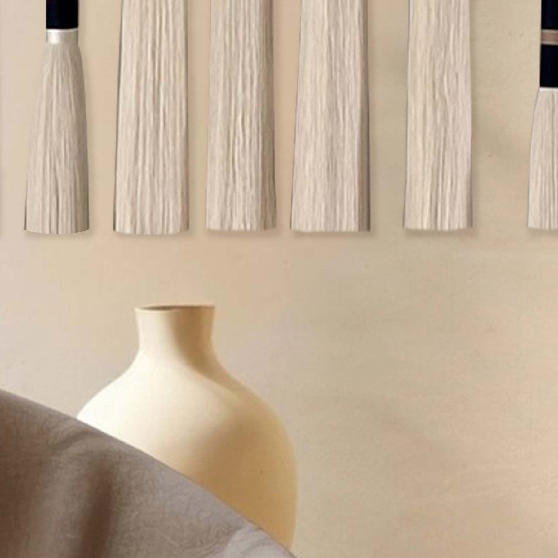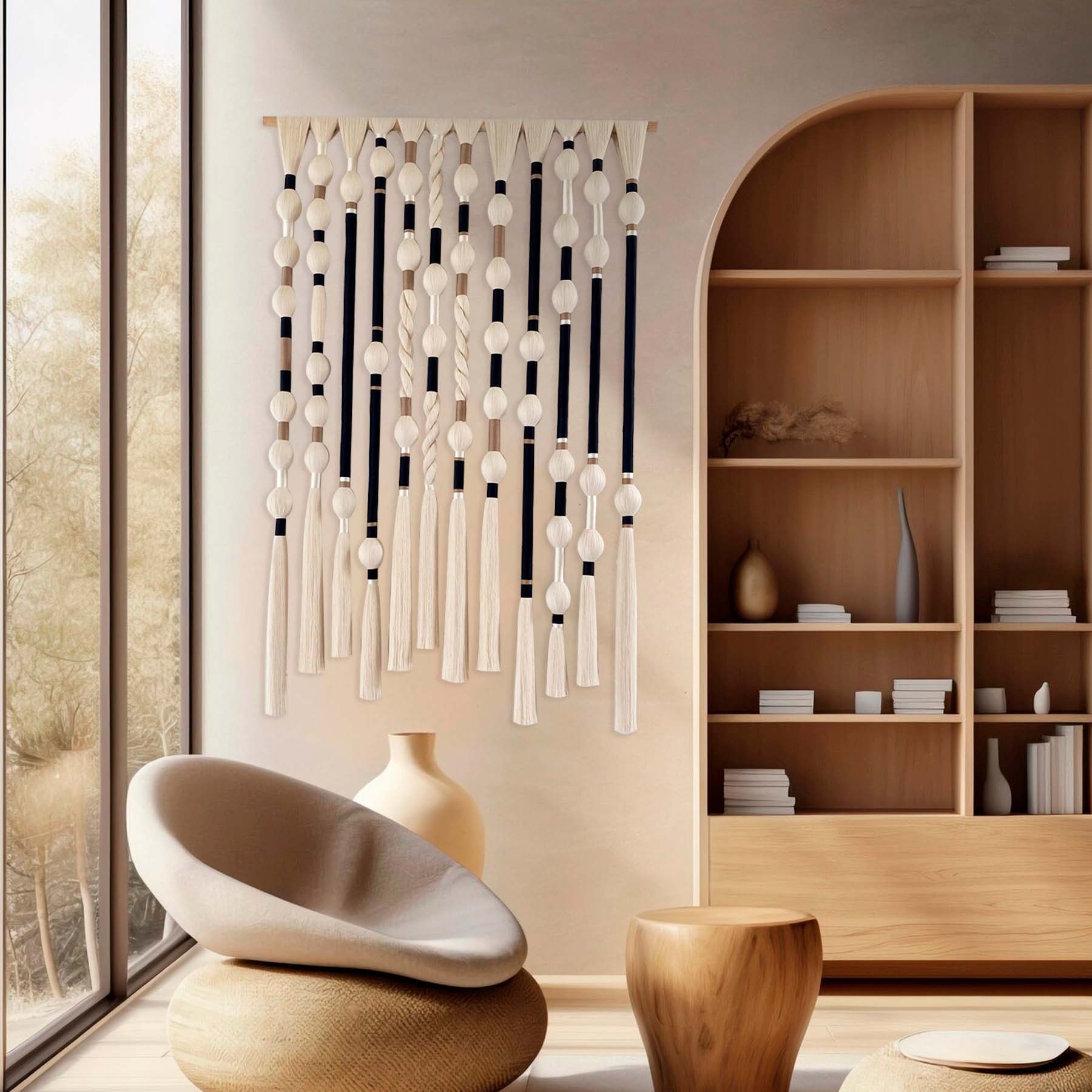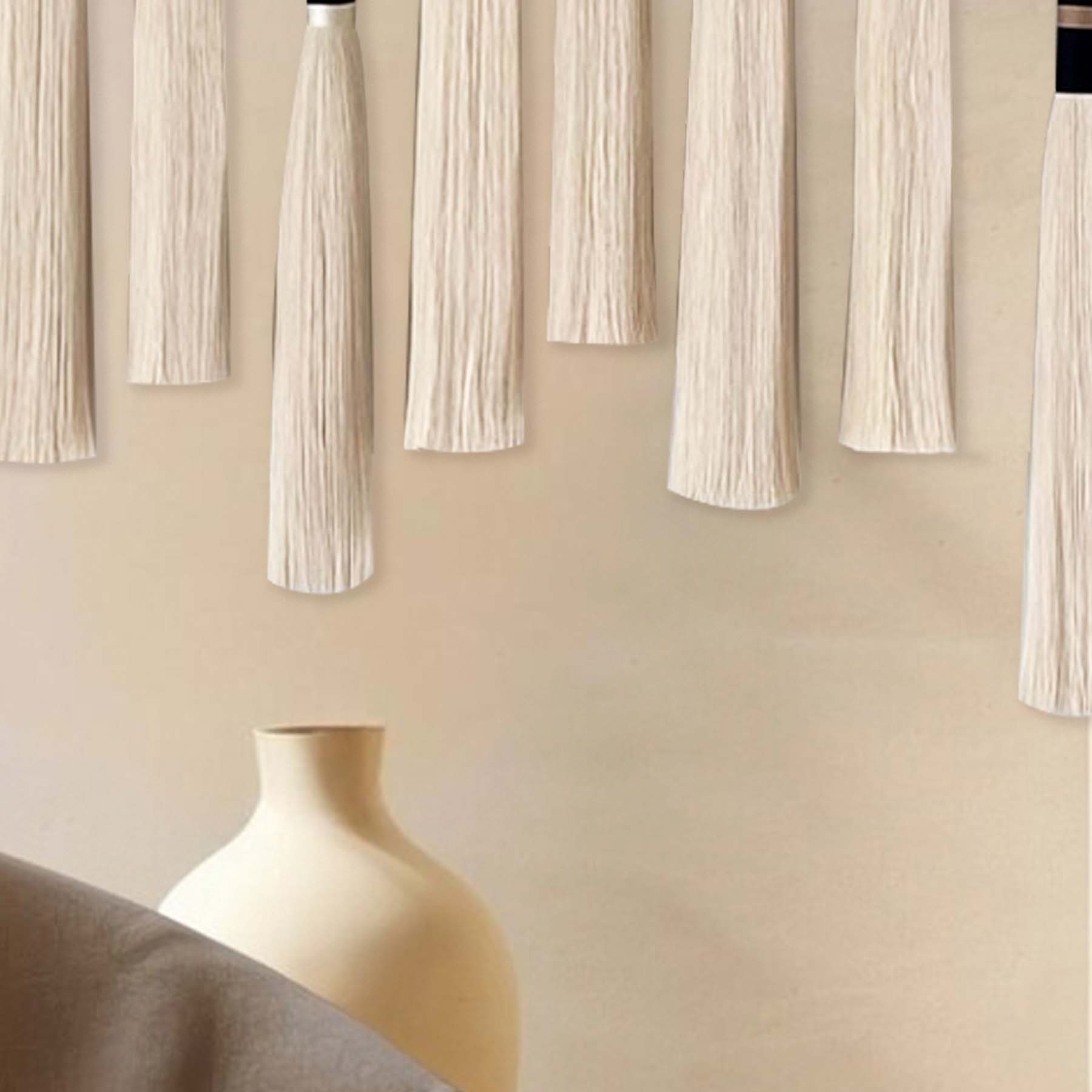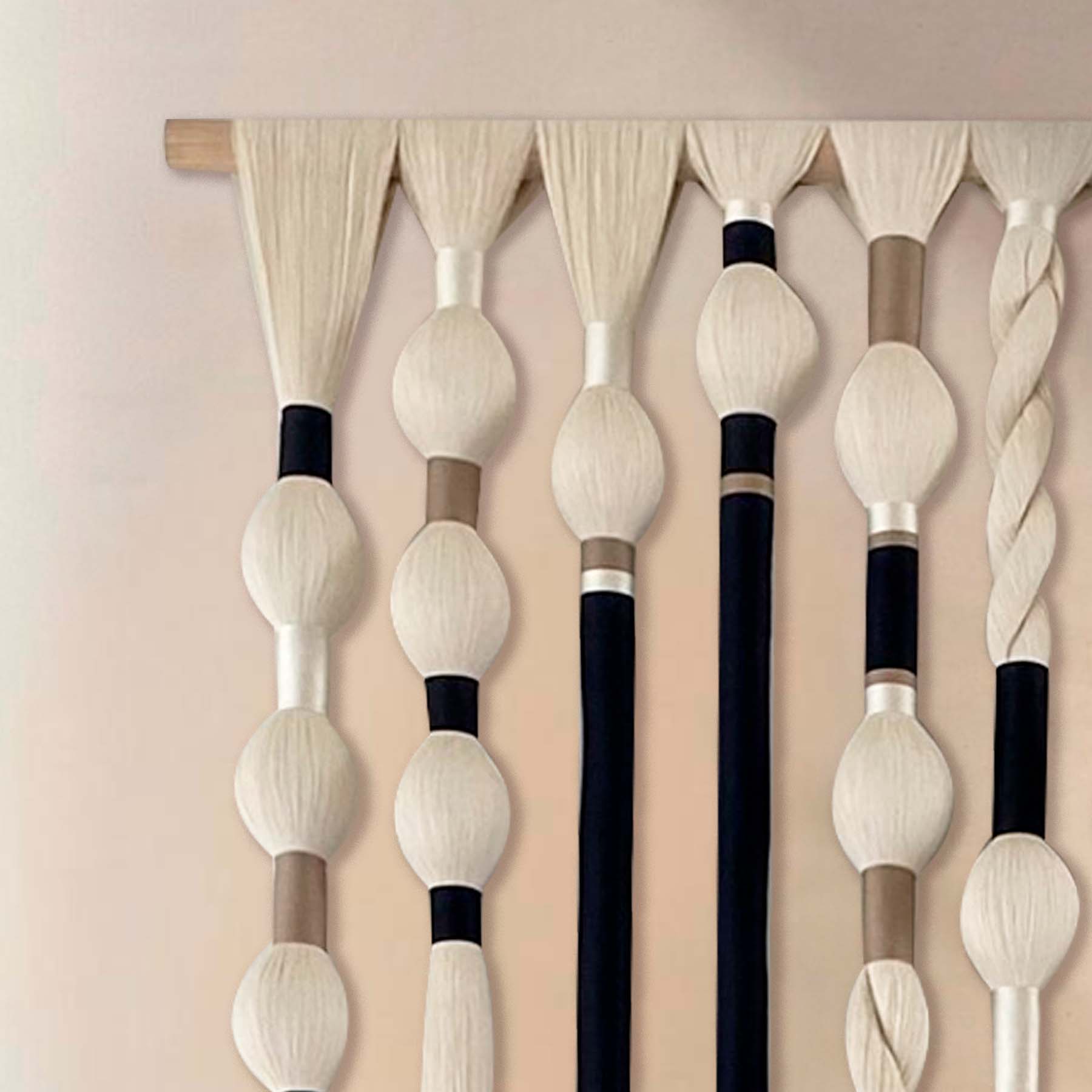 Este elegante tapiz artesanal, parte de nuestra colección Bricia, destaca por su composición vertical de nudos esféricos perfectamente alineados, con amarres en tonos neutros con un color predominante. Las tiras de hilaza almidonada estan colgadas sobre un bastón de madera natural. Trabajado cuidadosamente a mano, creando un ritmo visual con variaciones de torsiones y texturas. Ideal para separar espacios, vestir muros o enmarcar entradas con un toque contemporáneo y natural. Las diferencias entre cada pieza celebran la autenticidad del trabajo artesanal.